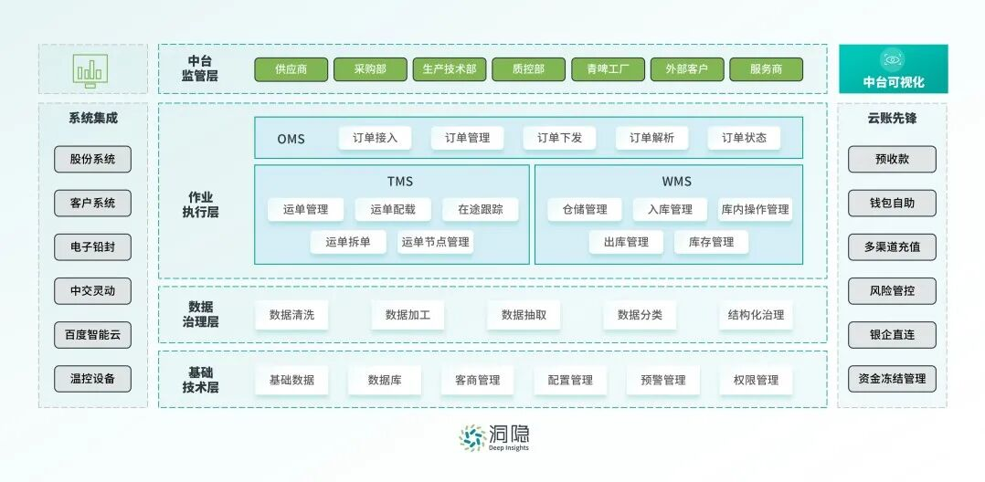合作之初,洞隐科技协助智链顺达构建了支撑全业务的“鸿鹄”物流平台。涵盖OMS(订单)、TMS(运输)、WMS(仓储)和BMS(计费)四大核心系统。这一阶段,我们实现了业务的“在线化”和“可视化”,初步达成了订单、物流、信息、资金、商流的“五流合一”。